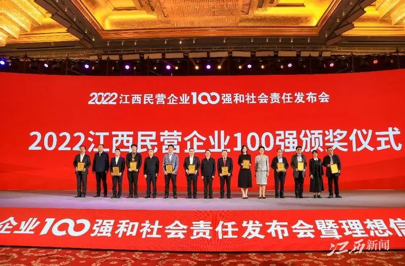 11月3日,2022江西民营企业100强和社会责任发布会暨理想信念教育报告会在南昌举行,会上发布了“2022江西民营企业100强榜单”、“2022江西制造业民营企业100强榜单”以及“2022江西服务业民营企业20强榜单”。